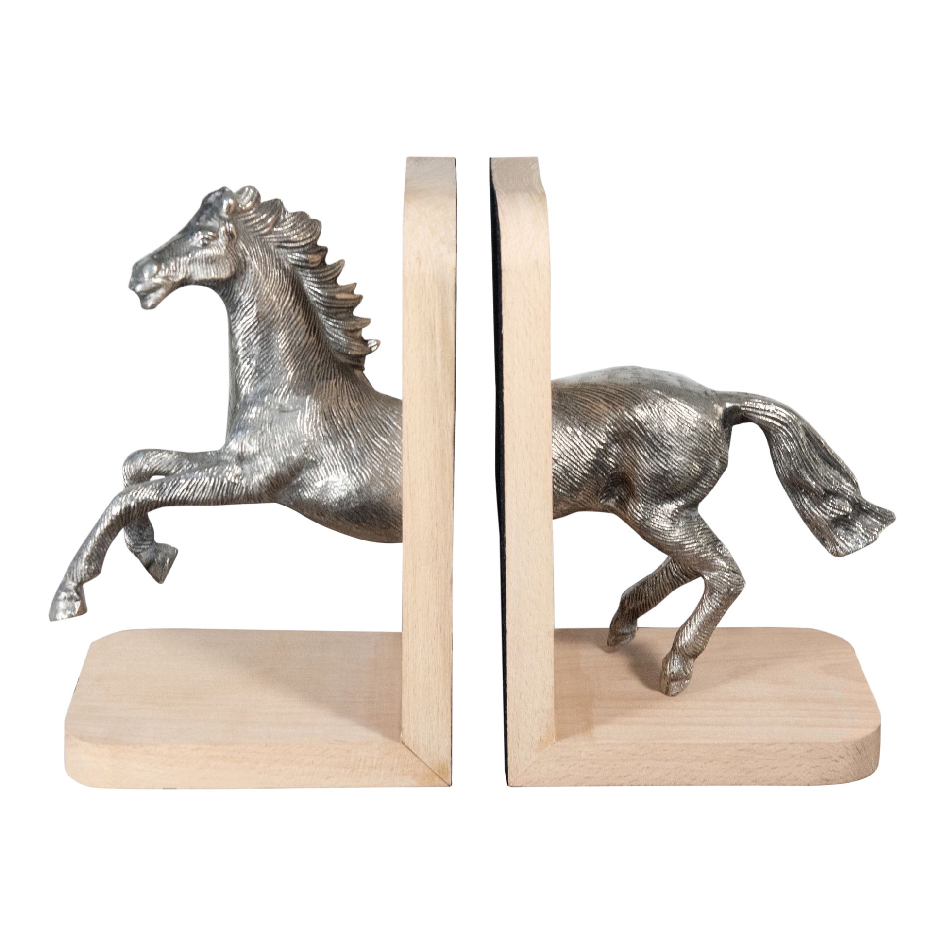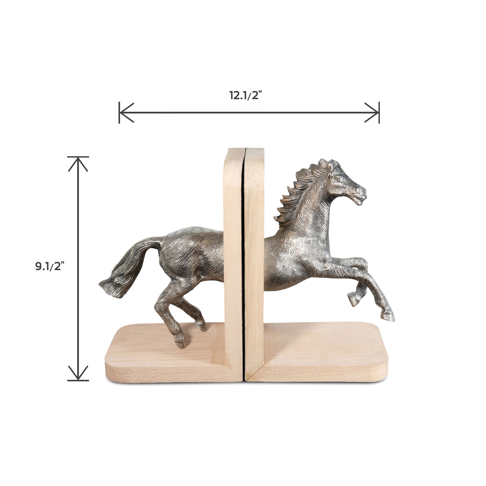 Aluminum and wooden running horse bookends made from high-quality Aluminum and Wooden with the design of horse. These Heavy-Duty bookends are ideal vintage and decorative collections for your bookshelves. You can use this decorative bookends as a good book lover decor. Also, It is an ideal gift idea for households, offices, or bookstores, easily preserve literary works.