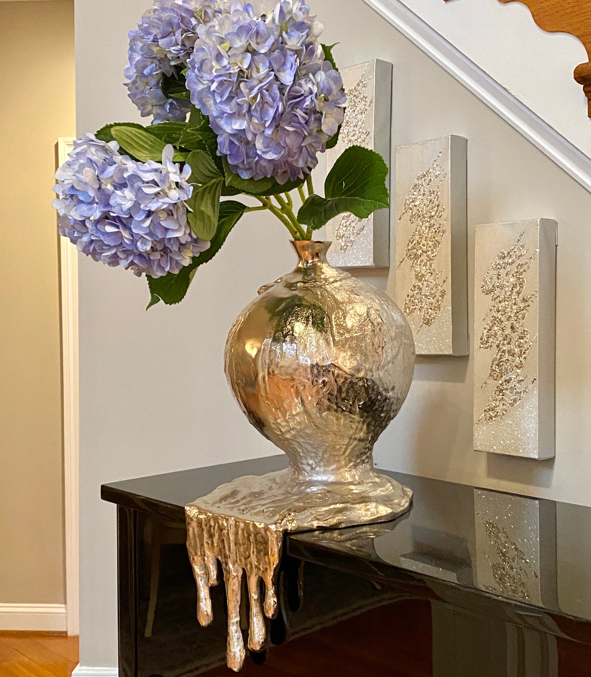 Antique Aluminum decorative round molten flower vase looks classy and elegant for your side table or bedside table and this metal flower vase is a fabulous option for contemporary or modern theme of home decor and table decor, This flower vase has a shape of molten aluminum that looks delicate on your center table or coffee table. This antique vase suits the decor for all occasions and events like parties, weddings, Christmas, Halloween decor, etc.